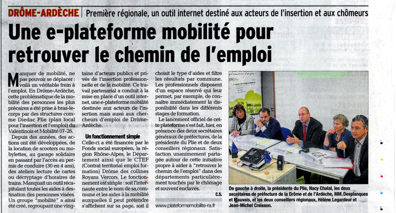 Une conférence de presse a été organisée lundi 3 novembre dans les locaux du DIEDAC PLIE du Valentinois, afin de présenter la e-plateforme mobilité co-construite avec l'association Mobilité 07 26. A tour de rôle, les intervenants se sont succédé afin de mettre en lumière les problématiques, les enjeux mais aussi les solutions proposées par le territoire pour lever les freins liés à la Mobilité.