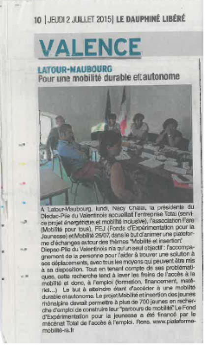 Le lundi 29 Juin 2015 le Groupe Total a été accueilli dans les locaux du DIEDAC PLIE du Valentinois dans le cadre d’une expérimentation liée au fond d’expérimentation pour la Jeunesse financé par le Mécénat Total impliquant 4 structures dont le DIEDAC PLIE DU Valentinois et Mobilité 07 26. La « Mobilité et insertion des jeunes rhônalpins » devrait permettre à plus de 700 jeunes en recherche d’emploi de construire leur « parcours mobilité »